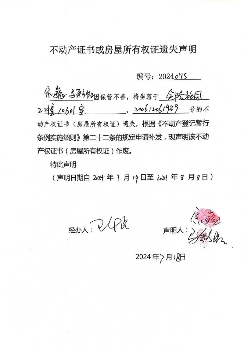 宋魏、馬彩虹不動(dòng)產(chǎn)證書(shū)或房屋所有權(quán)證遺失聲明 編號(hào):20240175