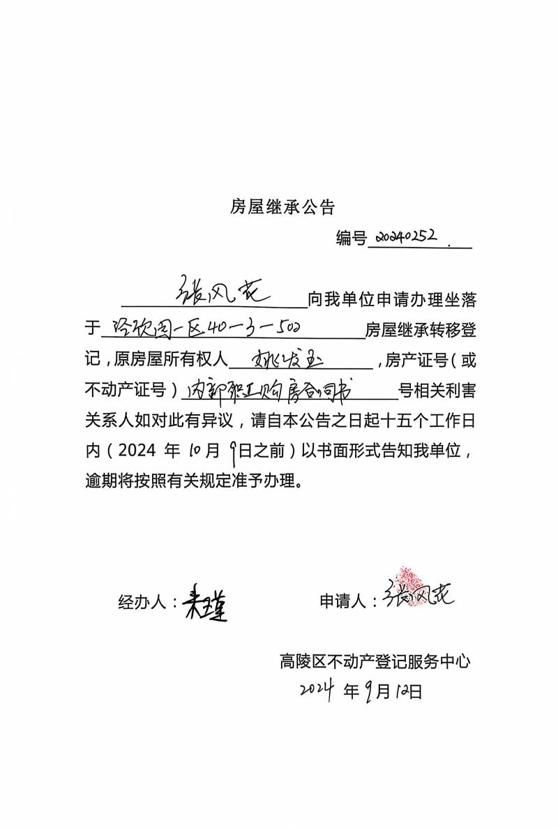張風(fēng)花房屋繼承公告 編號(hào):20240252