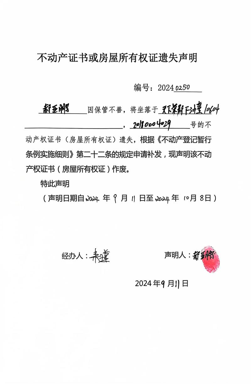 郝亞鵬不動產證書或房屋所有權證遺失聲明編號:20240250
