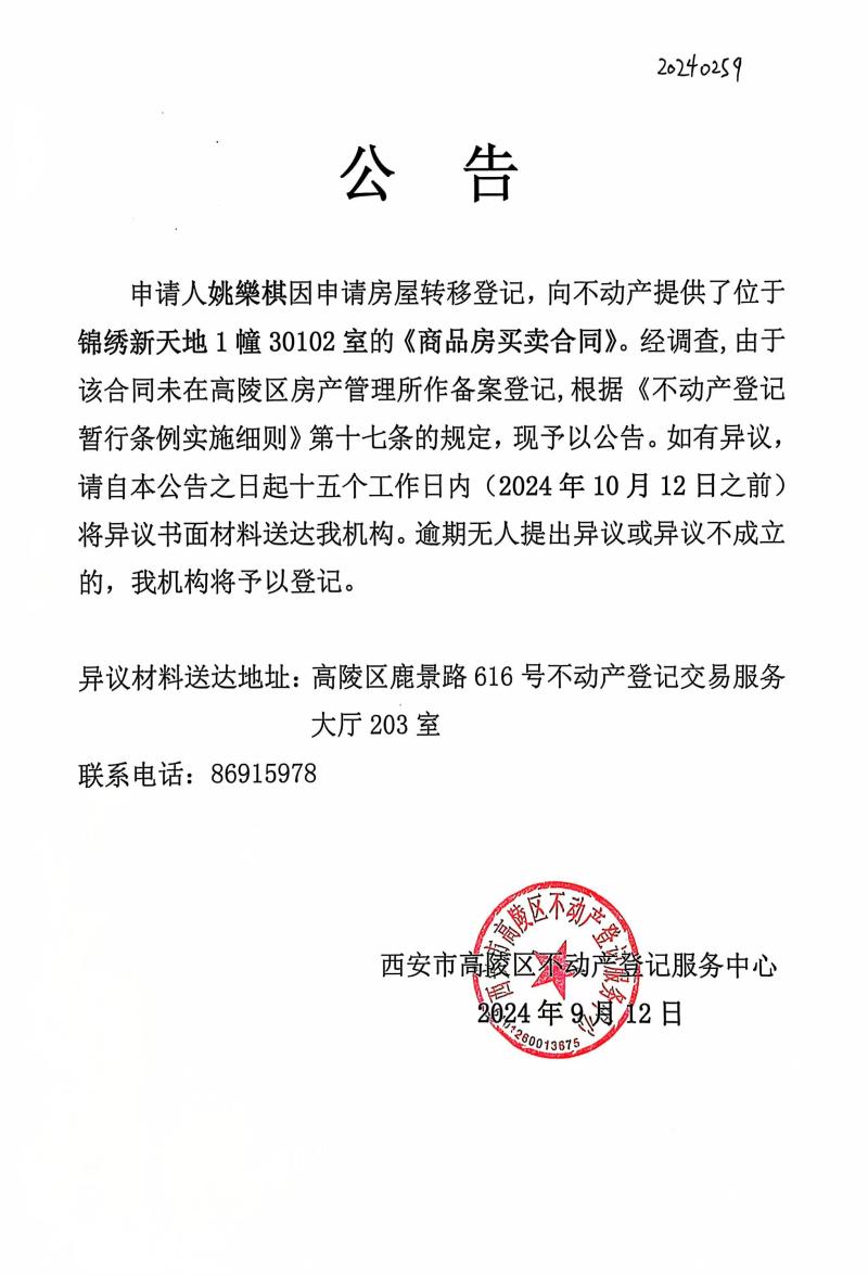 姚樂(lè)棋房屋轉(zhuǎn)移登記公告 編號(hào):20240259