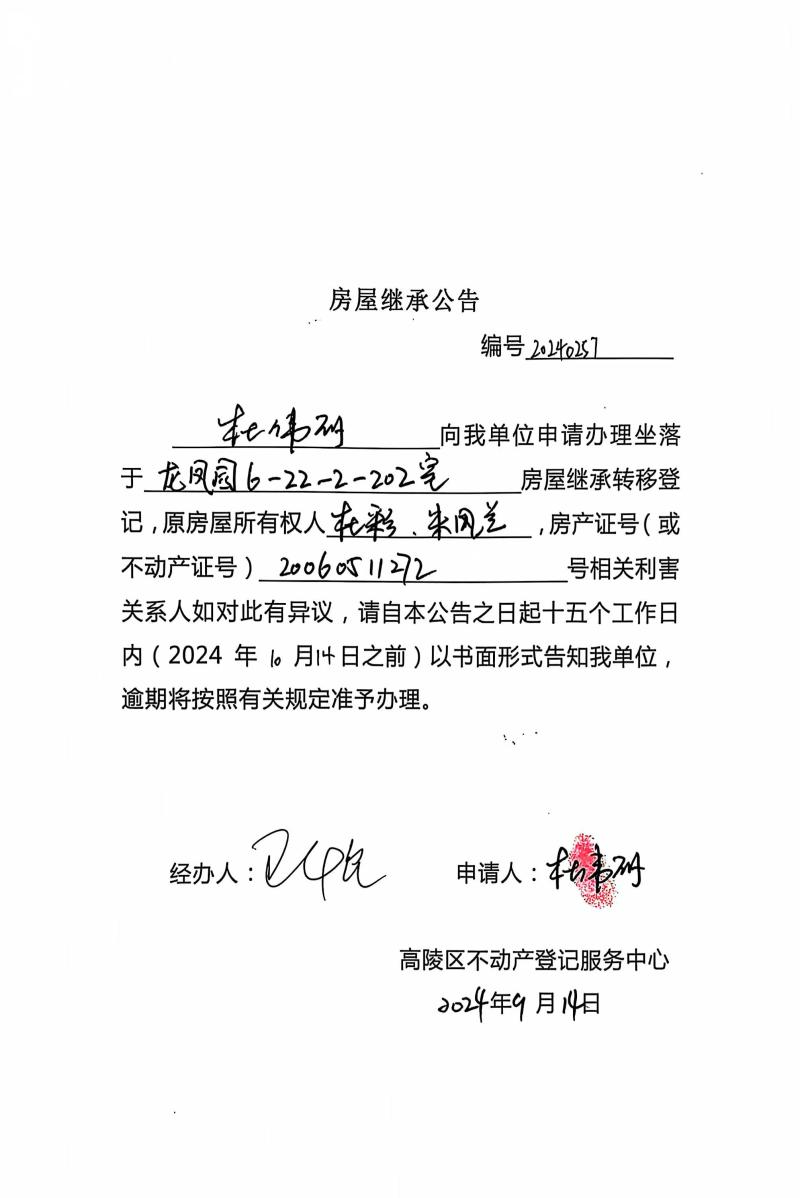 杜偉麗房屋繼承公告 編號(hào):20240257