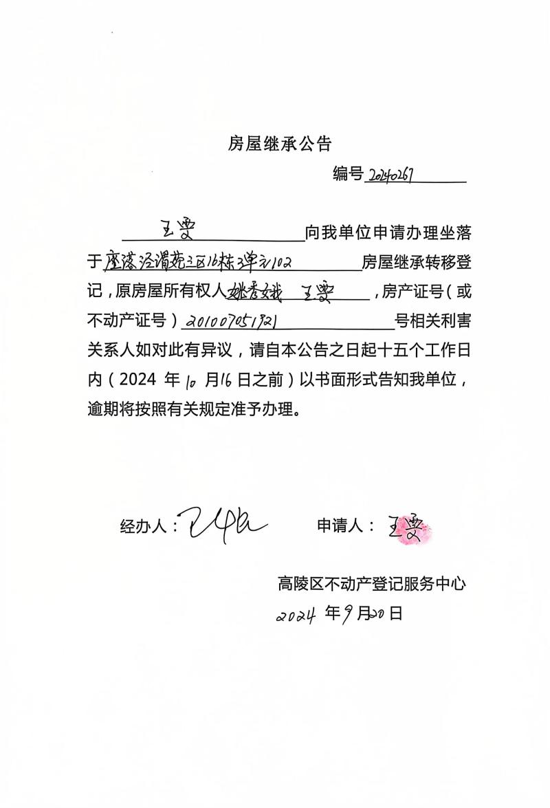 王雯房屋繼承公告 編號(hào):20240267