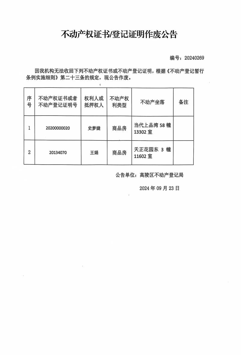 史夢婕、王娟不動產權證書/登記證明作廢公告 編號:20240269