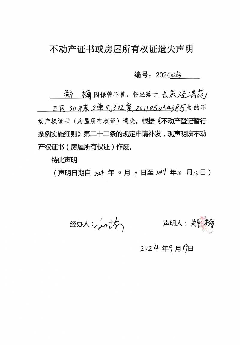 鄭梅不動(dòng)產(chǎn)證書或房屋所有權(quán)證遺失聲明編號(hào):20240263