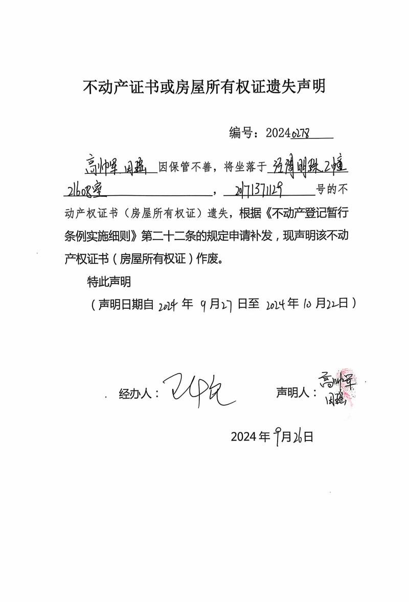 高帥軍、田瑤不動產證書或房屋所有權證遺失聲明編號:20240278