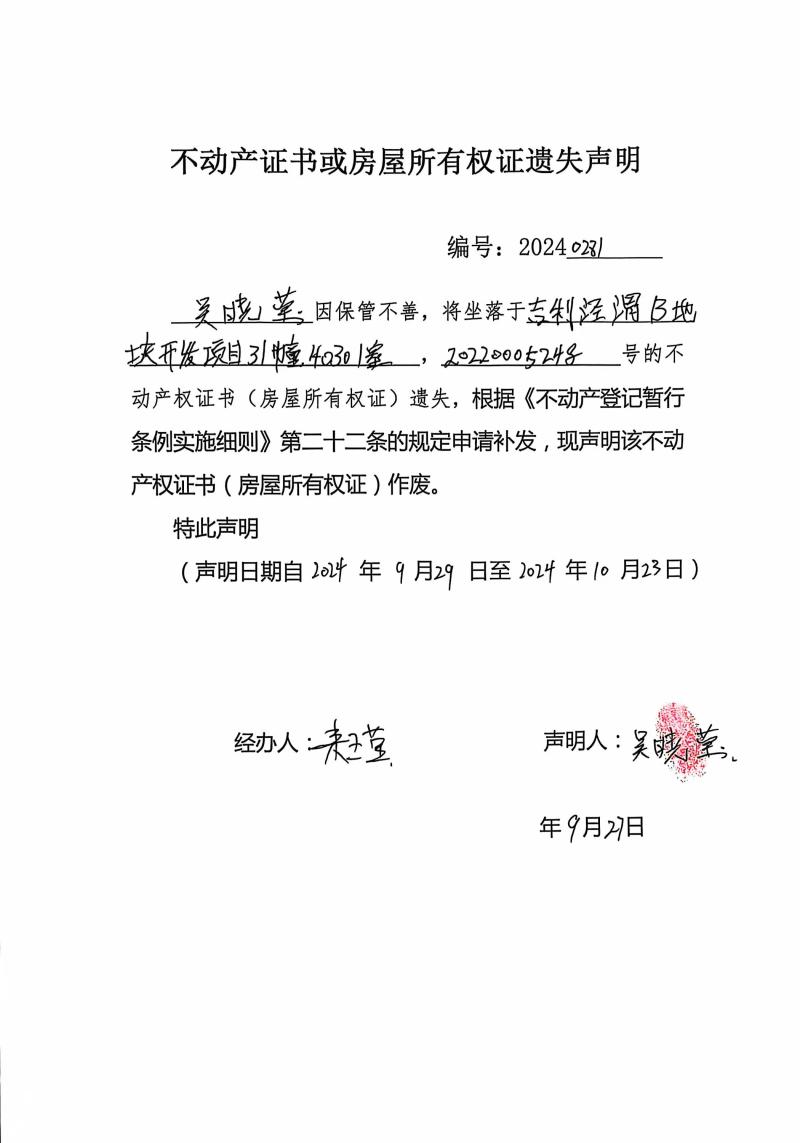 吳曉瑩不動(dòng)產(chǎn)證書或房屋所有權(quán)證遺失聲明編號(hào):20240281