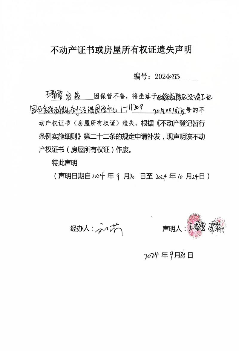王雷雷、安燕不動產證書或房屋所有權證遺失聲明編號:20240285