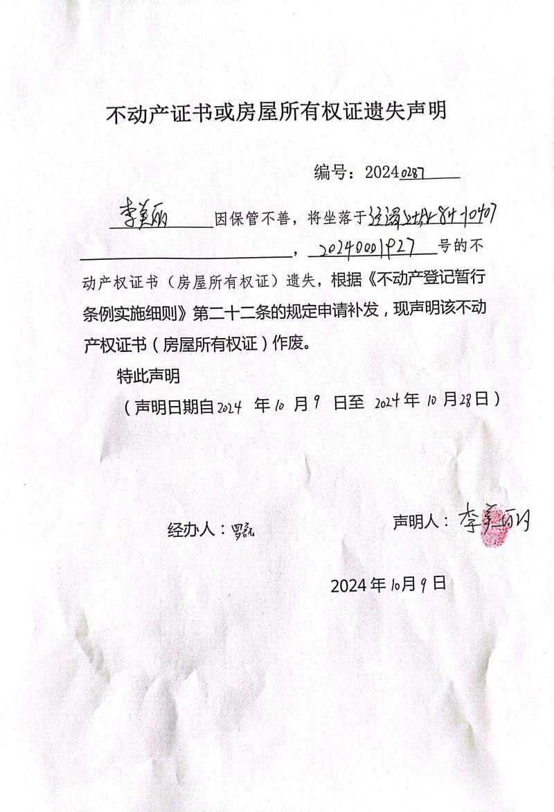 李美麗不動產證書或房屋所有權證遺失聲明編號:20240287