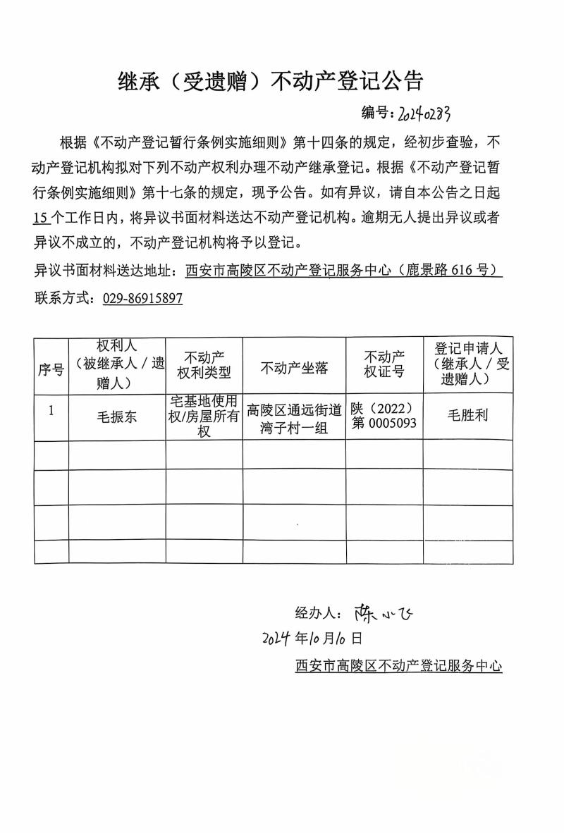 毛勝利繼承(受遺贈)不動產登記公告 編號:20240283