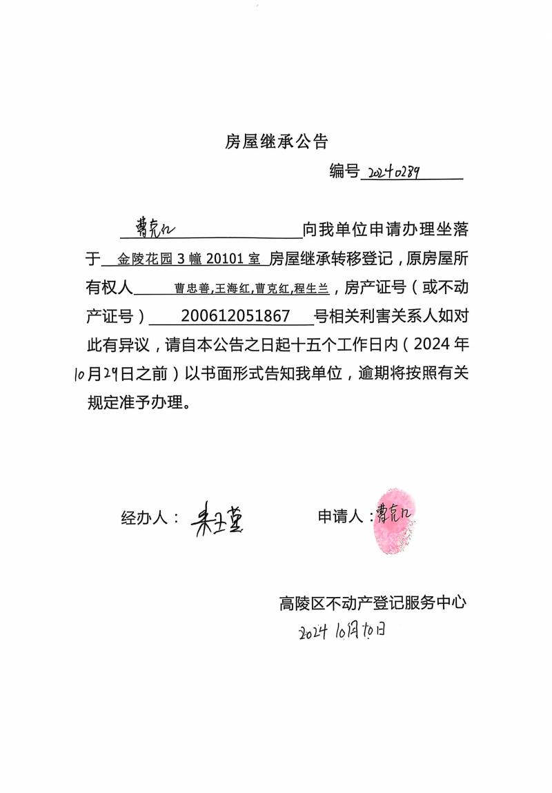 曹克紅房屋繼承公告 編號:20240289