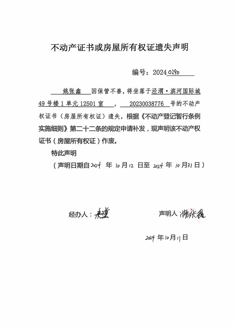 姚張鑫不動產(chǎn)證書或房屋所有權(quán)證遺失聲明編號:20240290