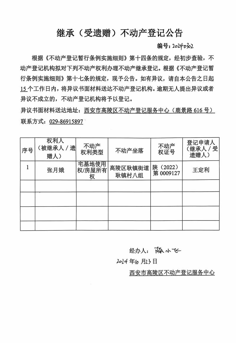 王定利繼承(受遺贈(zèng))不動(dòng)產(chǎn)登記公告 編號(hào):20240302