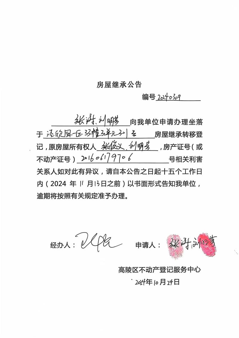 張濤、劉明芳房屋繼承公告 編號:20240309