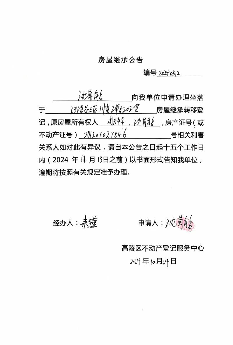 沈菊能房屋繼承公告 編號:20240312