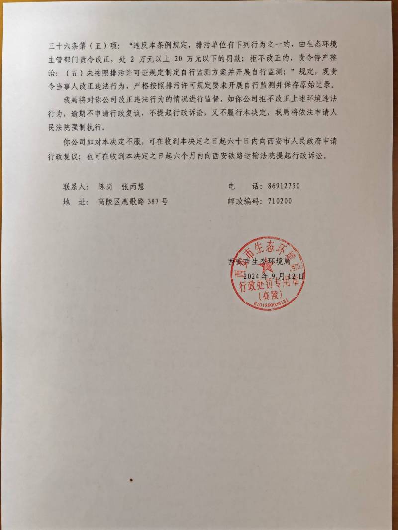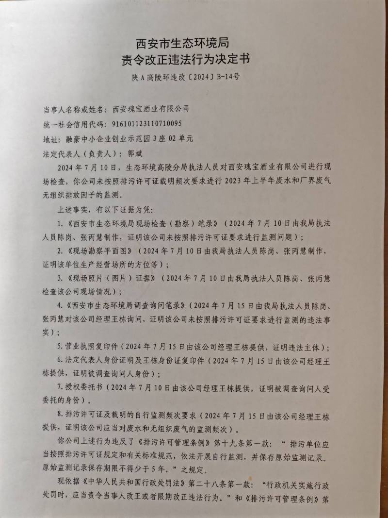 西安市生態環境局高陵分局責令改正違法行為決定書陜A高陵環違改【2024】B-14號