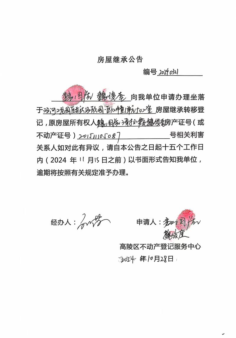 魏國虎、魏俊奎房屋繼承公告 編號:20240321