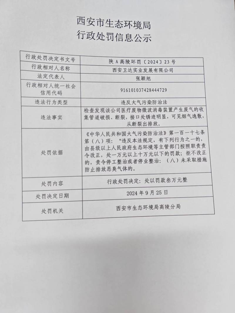西安市生態環境局行政處罰決定書陜A高陵環罰【2024】23號