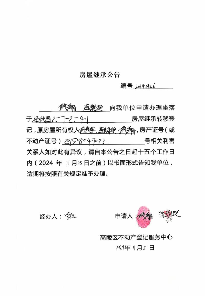 候翔、苗銅玲房屋繼承公告 編號:20240326