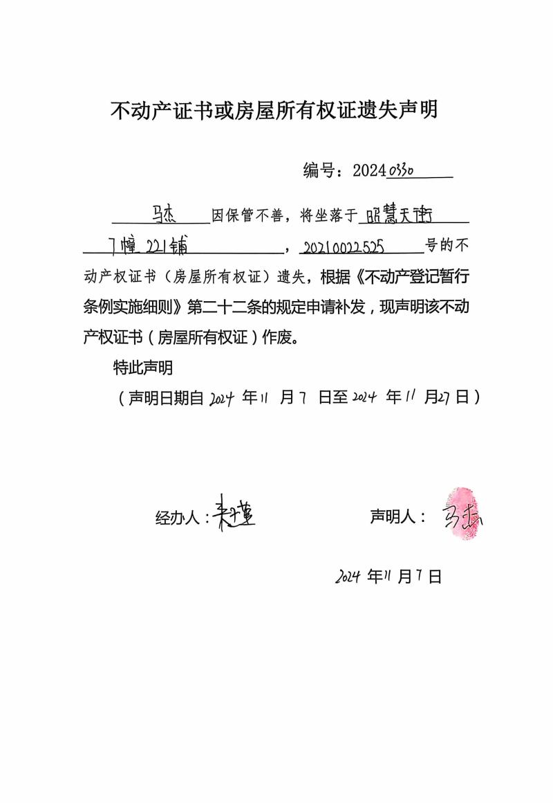 馬杰不動產證書或房屋所有權證遺失聲明編號:20240330