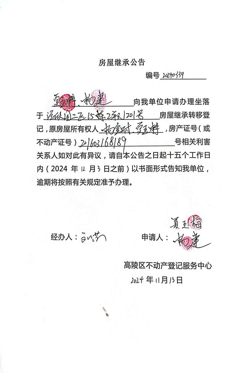 夏玉梅、楊建房屋繼承公告 編號:20240339