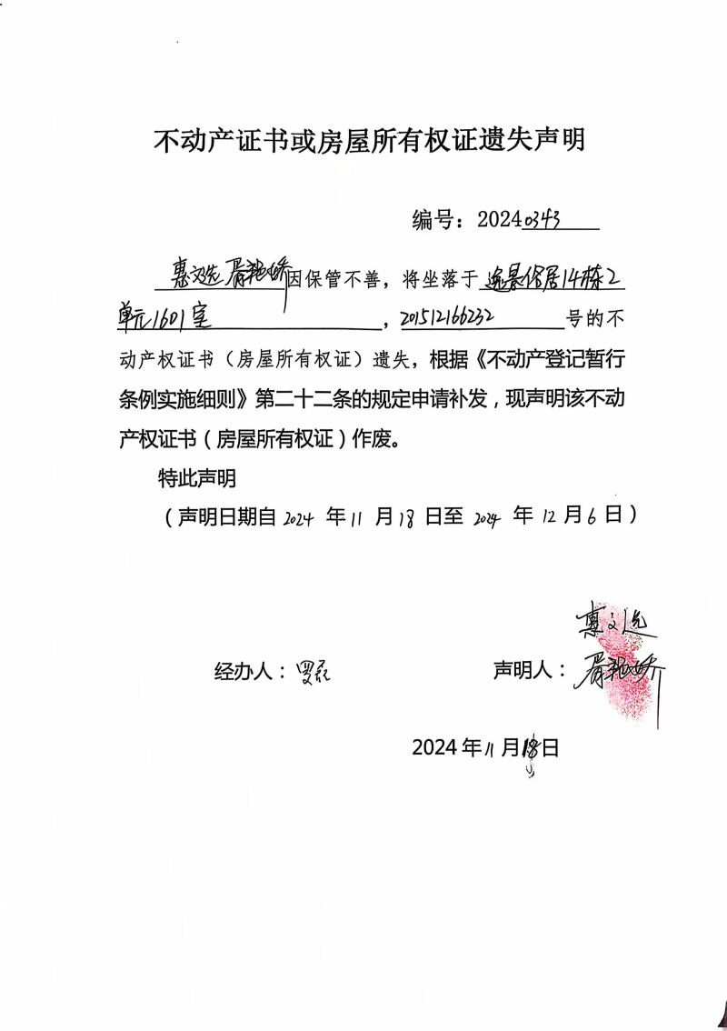惠文選,胥艷嬌不動產證書或房屋所有權證遺失聲明編號:20240343