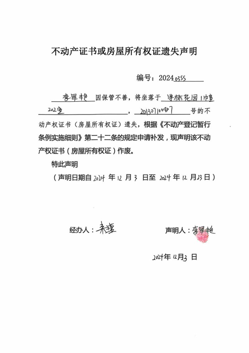 李軍艷不動產證書或房屋所有權證遺失聲明,編號:20240355