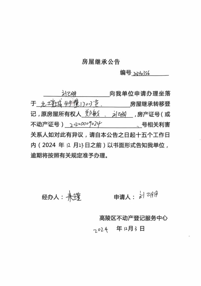 劉衛朋房屋繼承公告,編號:20240356