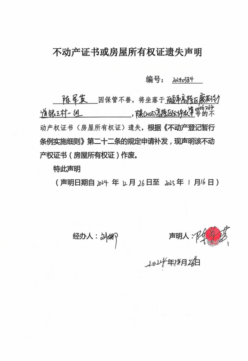 陳軍英不動(dòng)產(chǎn)證書或房屋所有權(quán)證遺失聲明編號(hào):20240384