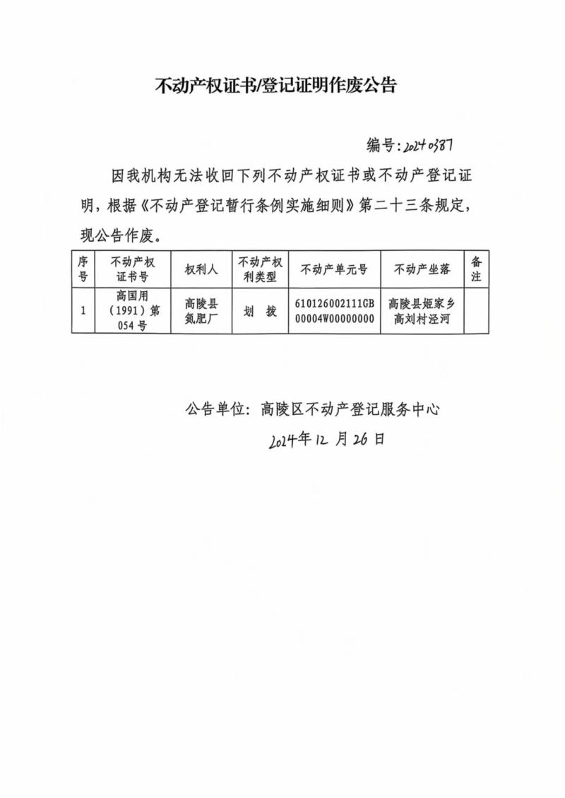 高陵縣氮肥廠不動產權證書/登記證明作廢公告,編號:20240387