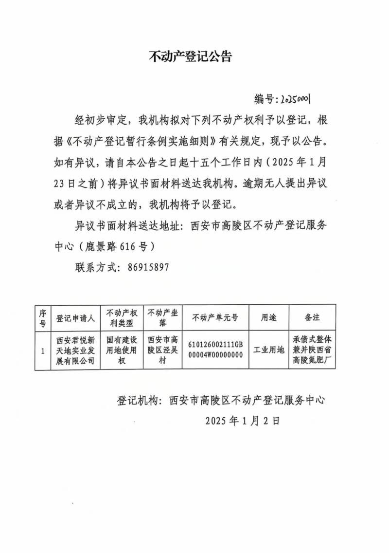 西安君悅新天地實業發展有限公司不動產登記公告 編號:20250001