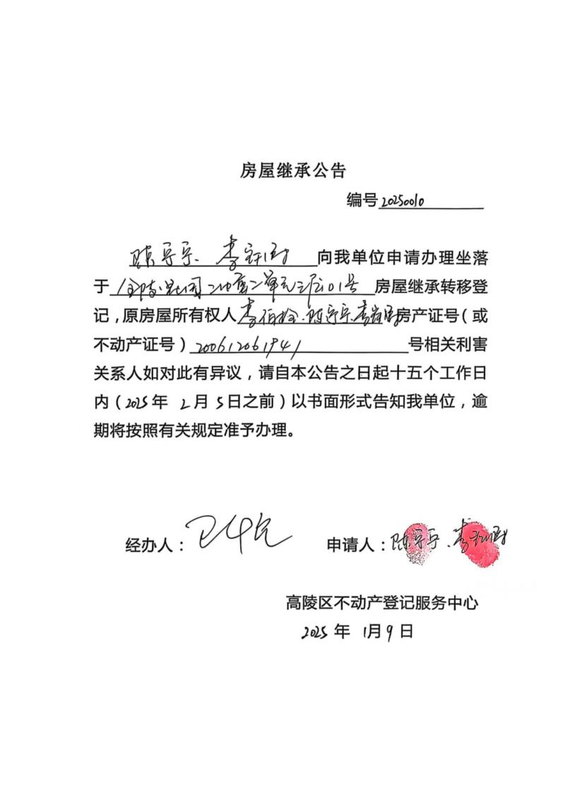 陳寧寧、李岸濤房屋繼承公告,編號:20250010