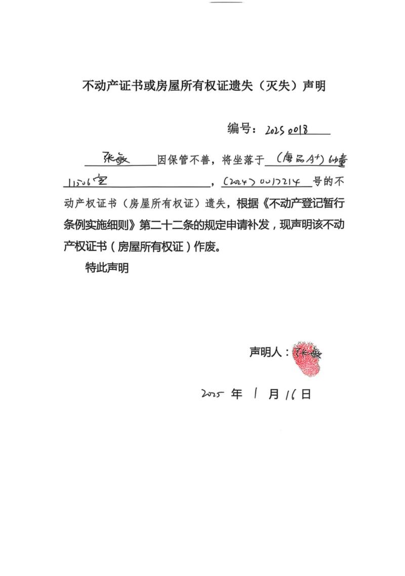 張敏不動(dòng)產(chǎn)證書或房屋所有權(quán)證遺失聲明編號(hào):20250018