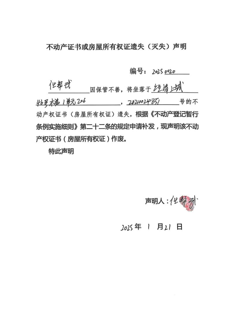 任幫武不動產證書或房屋所有權證遺失聲明編號:20250020