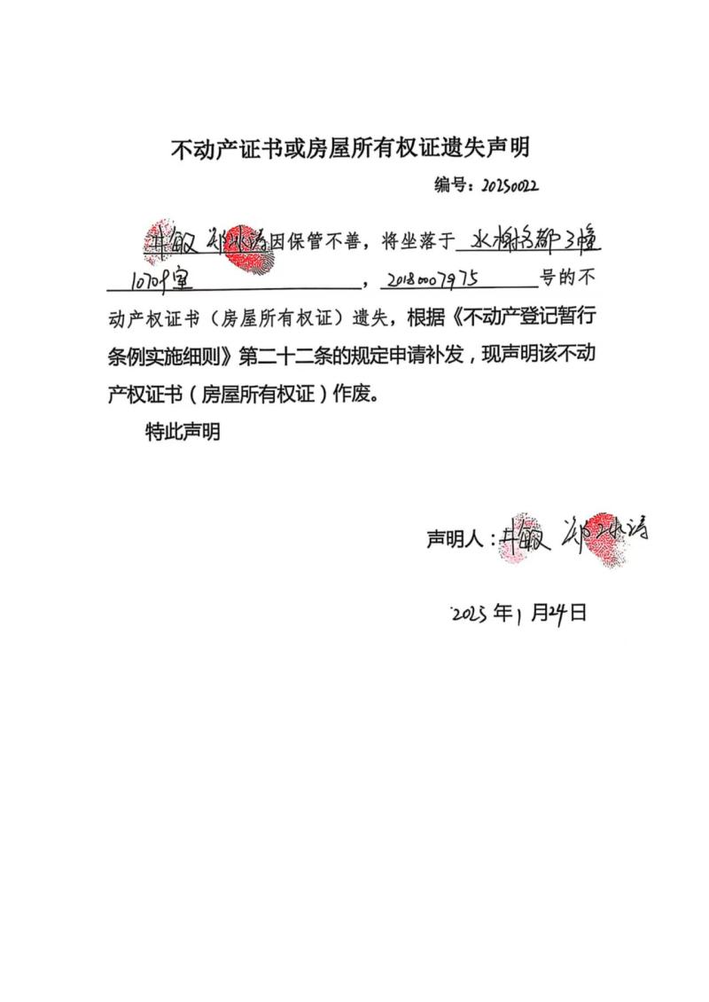 井敏、鄭冰濤不動產證書或房屋所有權證遺失聲明編號:20250022