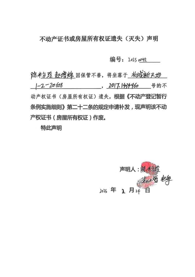 陳粉玲、趙增輝不動(dòng)產(chǎn)證書或房屋所有權(quán)證遺失(滅失)聲明編號(hào):20250042