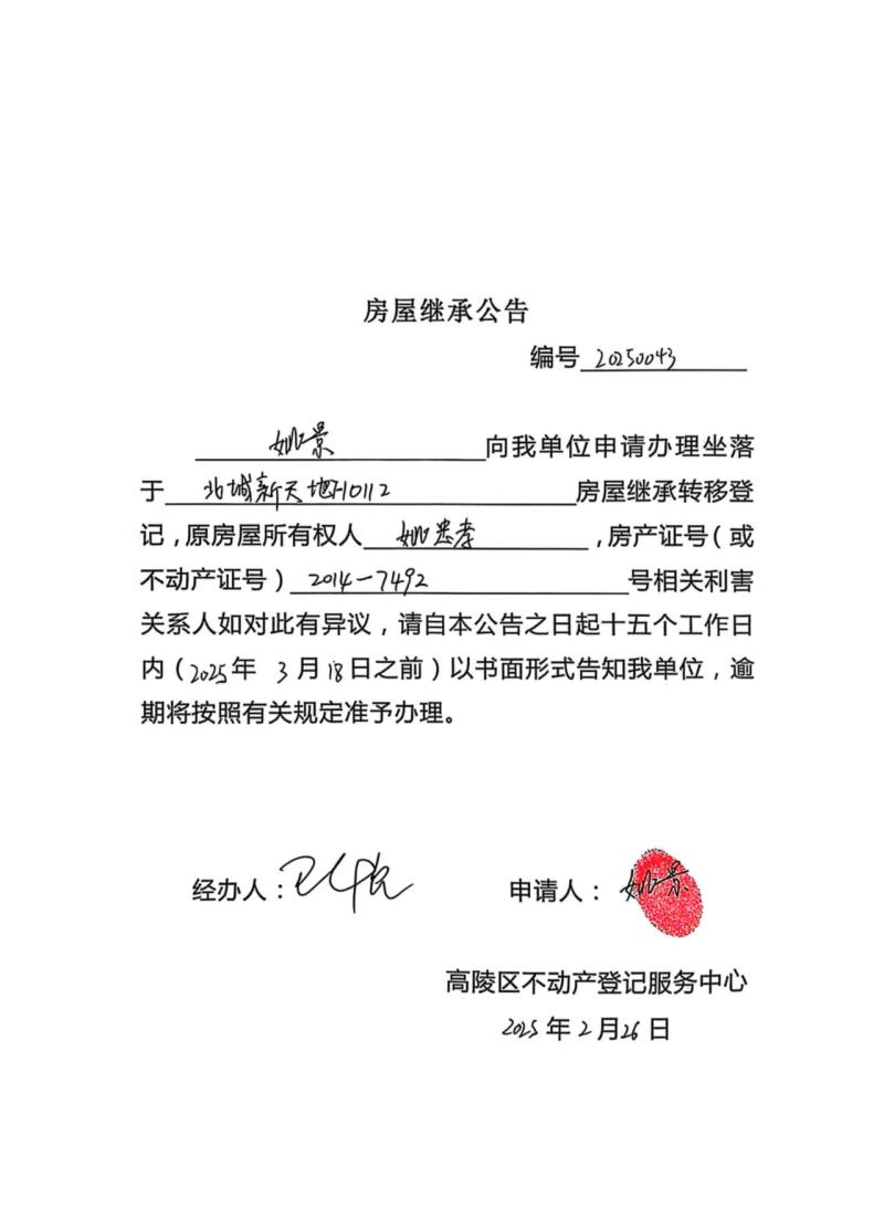 姚景房屋繼承公告,編號:20250043