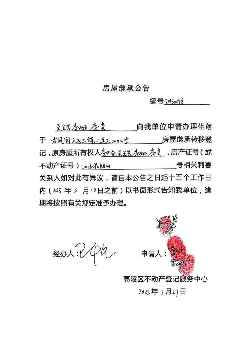 吳蘭芳、李娜、李奕房屋繼承公告,編號:20250048
