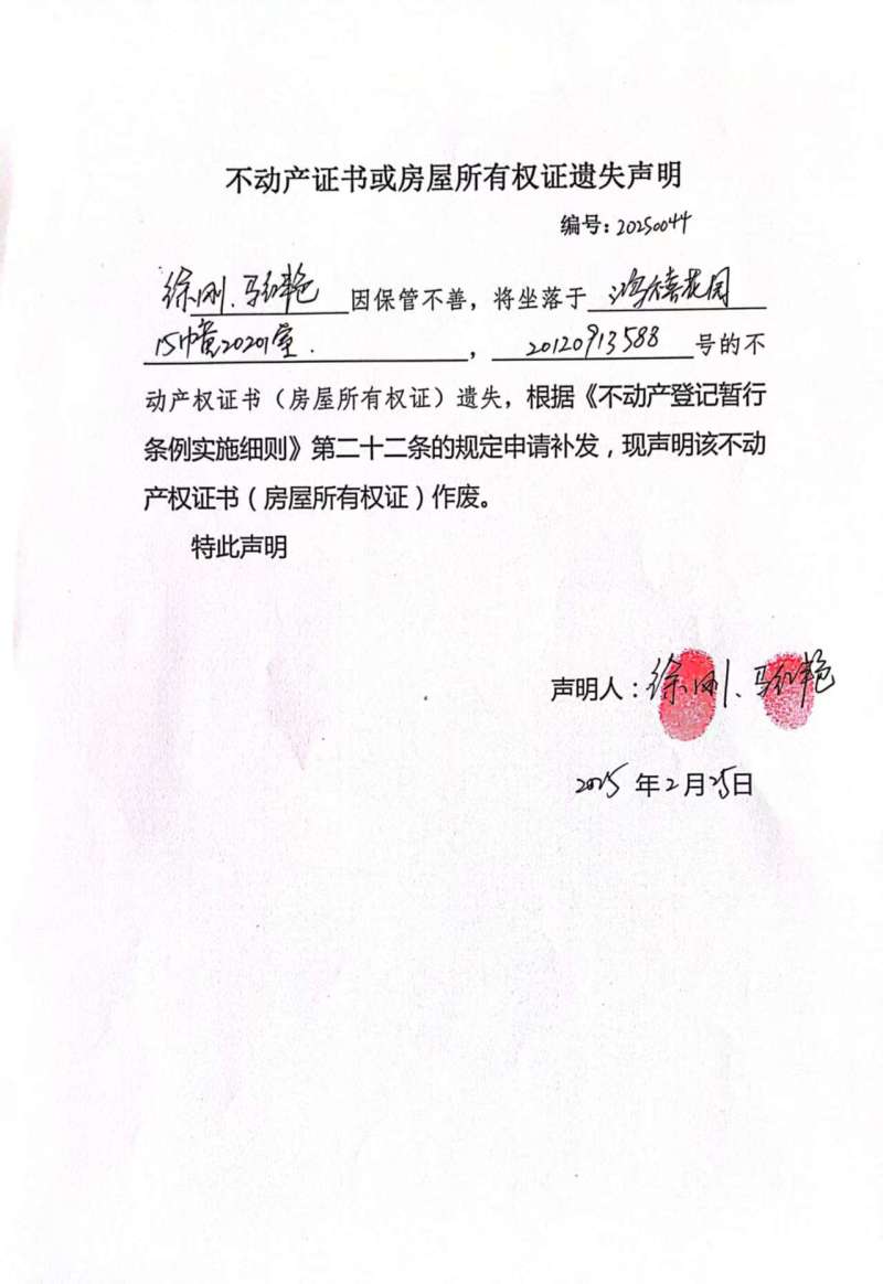 徐剛、馬紅艷不動產證書或房屋所有權證遺失(滅失)聲明編號:20250044