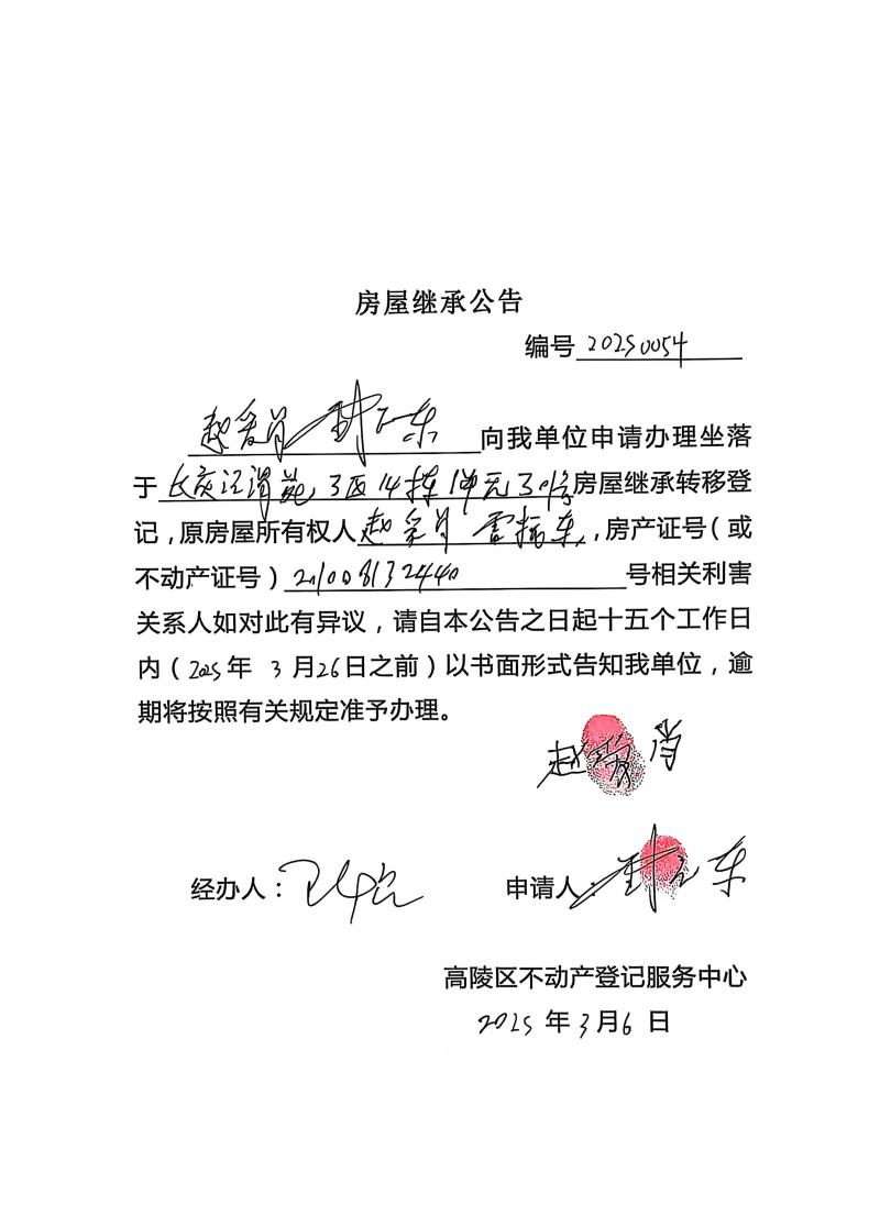趙愛(ài)肖、雷振東房屋繼承公告,編號(hào):20250054