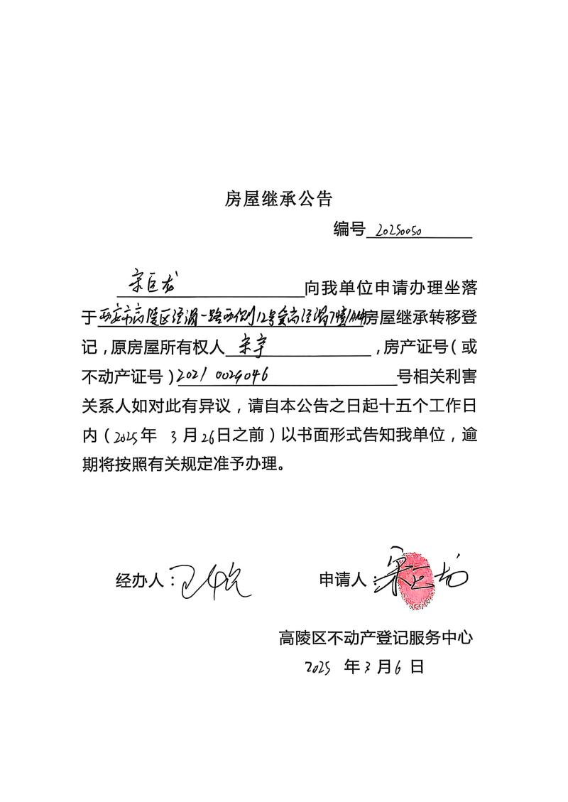 宋巨龍房屋繼承公告,編號(hào):20250050