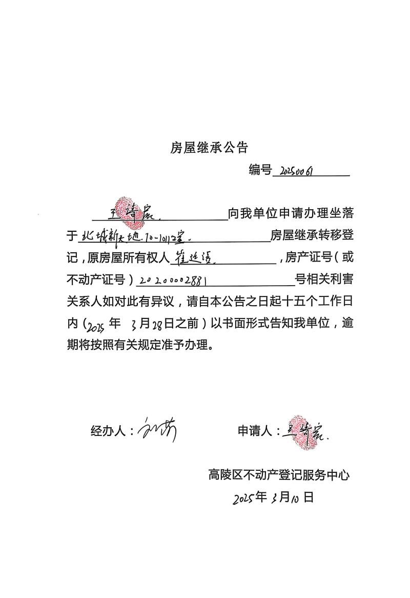 王靖宸房屋繼承公告,編號:20250061