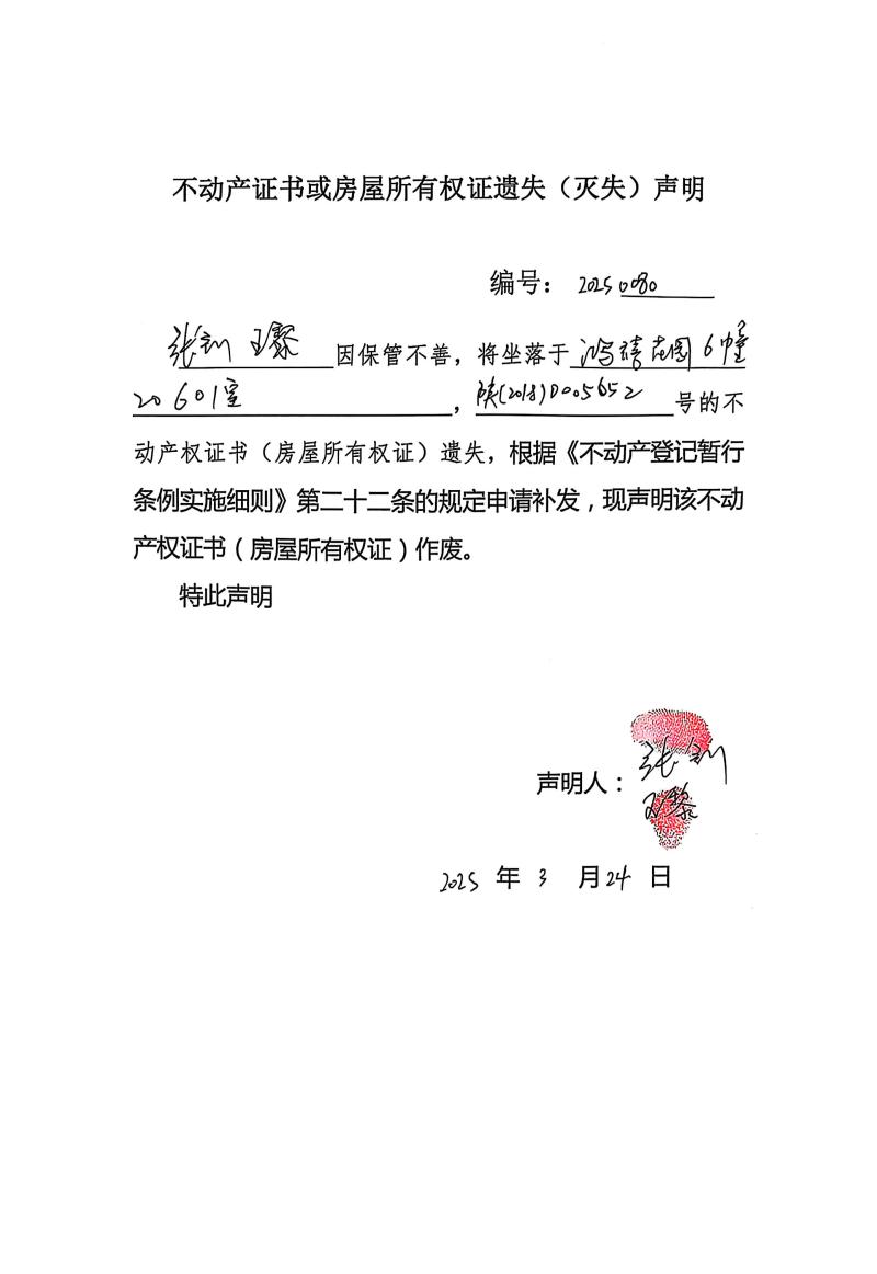 張釗、王黎不動產證書或房屋所有權證遺失(滅失)聲明,編號:20250080