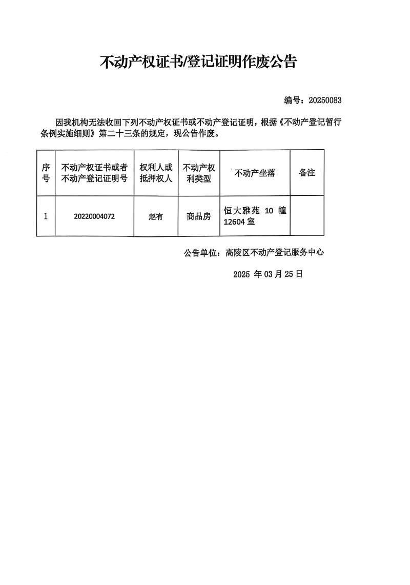 趙有不動產權證書/登記證明作廢公告,編號:20250083