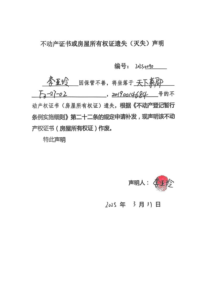 李亞玲不動產證書或房屋所有權證遺失(滅失)聲明,編號:20250090
