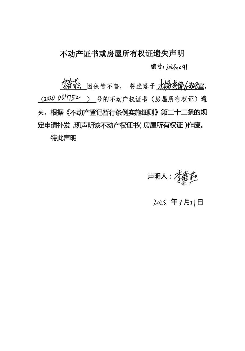 李春燕不動產證書或房屋所有權證遺失聲明編號:20250091