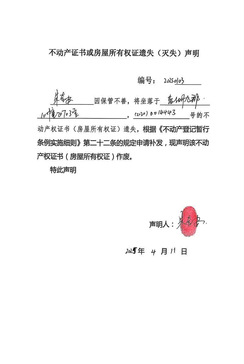 朱奎安不動產證書或房屋所有權證遺失(滅失)聲明,編號:20250103