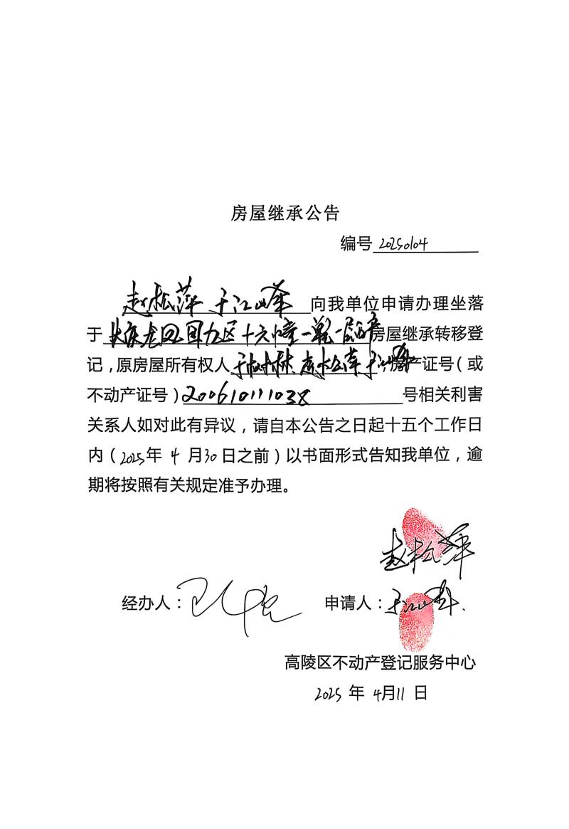 趙松萍、于江峰房屋繼承公告,編號:20250104