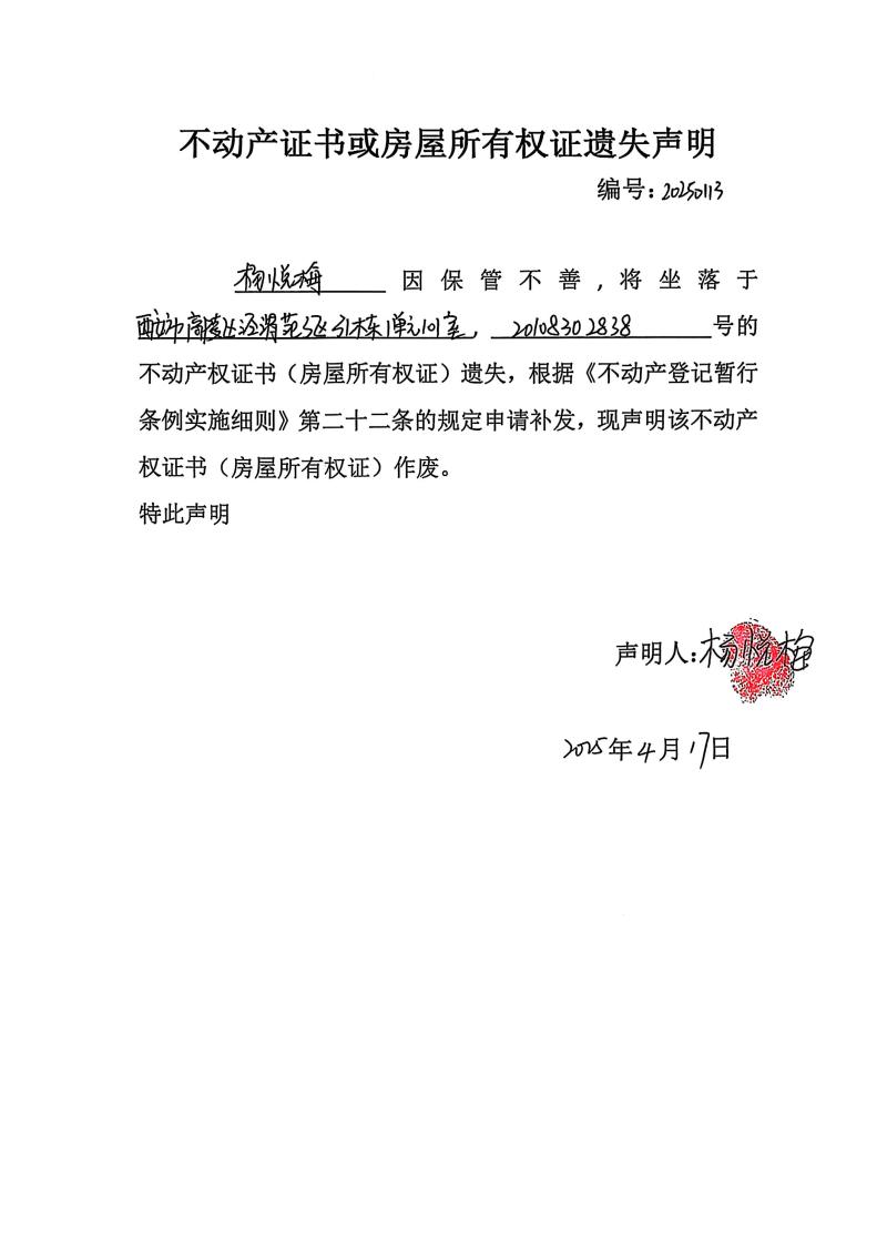 楊悅梅不動產證書或房屋所有權證遺失聲明,編號:20250113