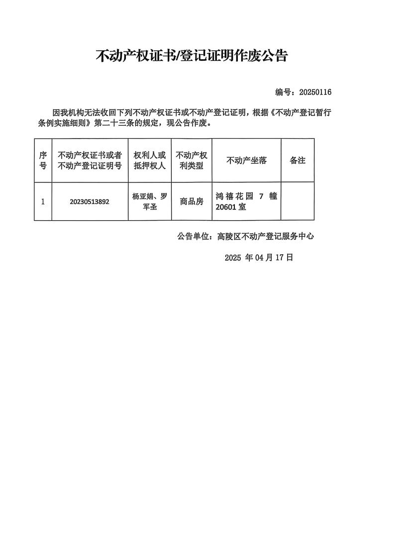楊亞娟、羅軍圣不動(dòng)產(chǎn)權(quán)證書/登記證明作廢公告,編號(hào):20250116