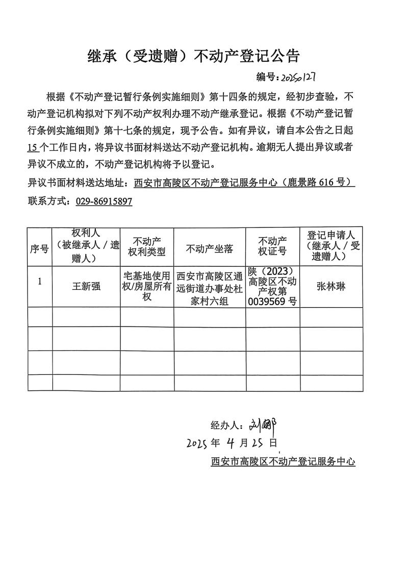 張林琳繼承(受遺贈)不動產(chǎn)登記公告,編號:20250127